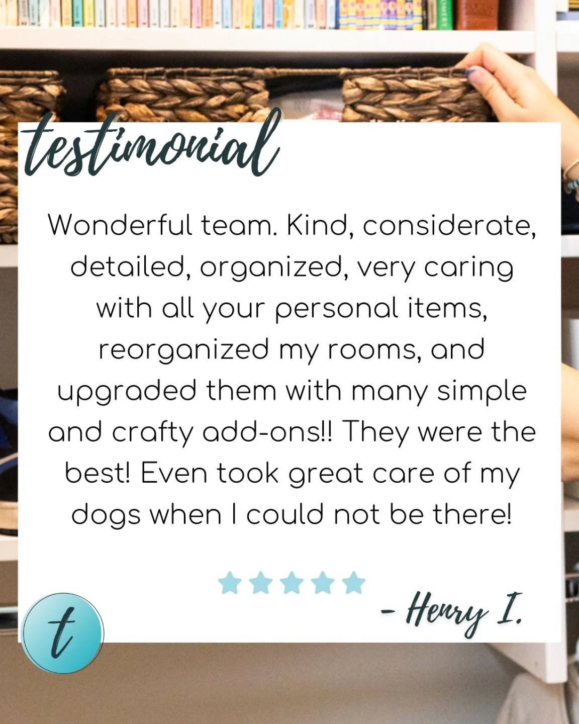 When you invite us into your home, we will create a custom plan for reinventing your space. We will clear everything out while helping you sort and declutter. Finally, we organize everything into the unique system we designed for you and we celebrate your new space!