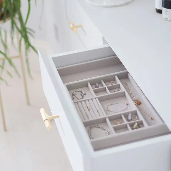 Prefer to use drawers for organizing jewelry? This velvet expandable drawer tray will keep your jewelry organized and prevent tarnishing. Shop here