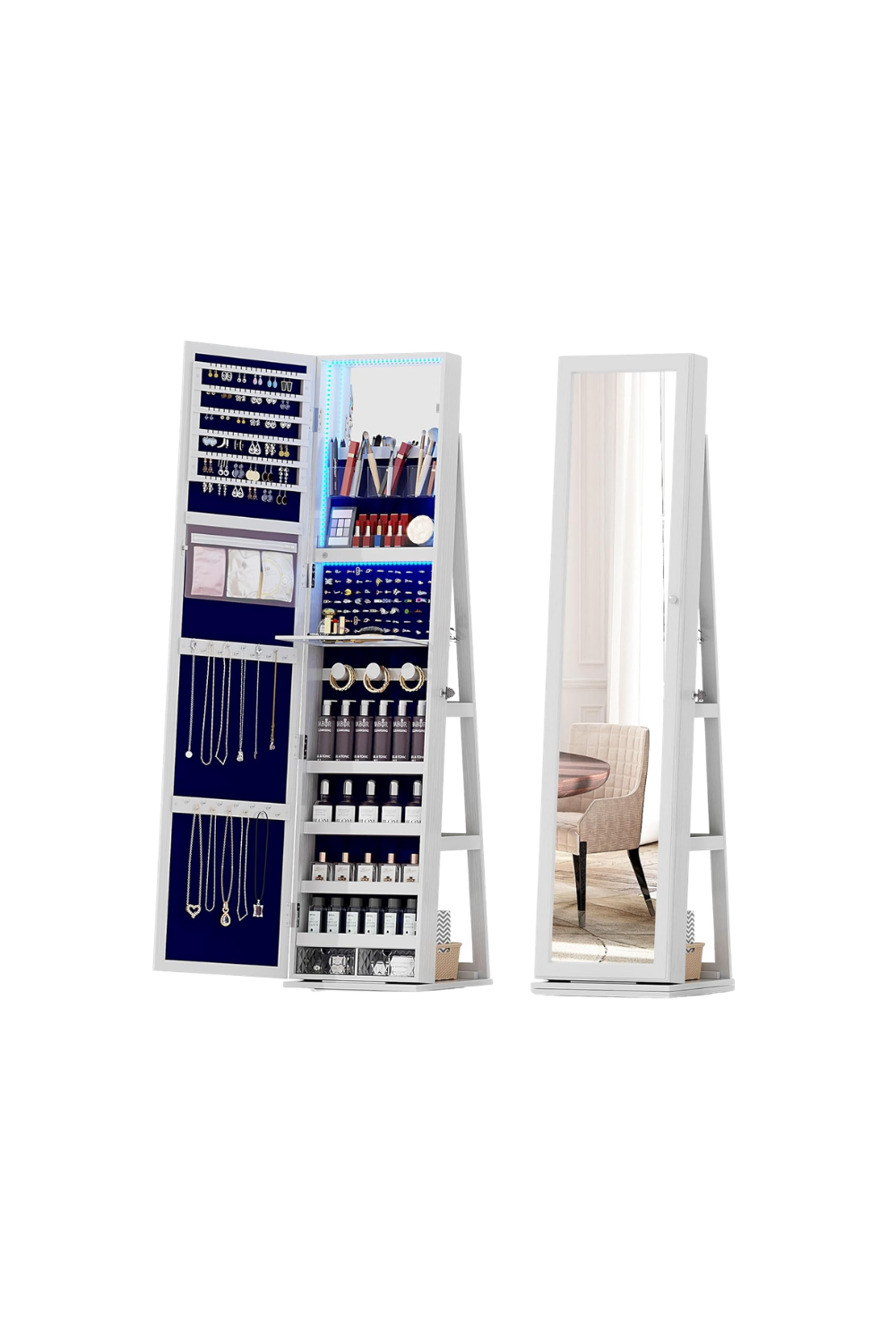 This jewelry armoire has it all! Lots of storage capacity for your jewelry, a small mirror to help you decide what you want to wear, and a full-length mirror to check your outfit. It also rotates 360 degrees. Shop here