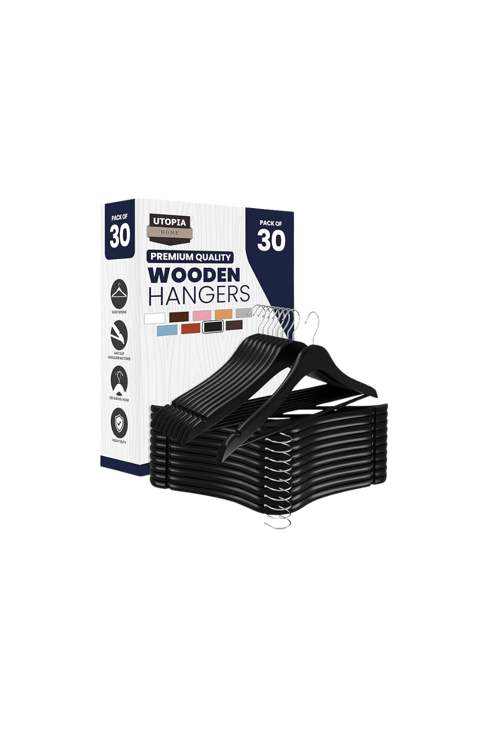 Wooden hangers provide durable support for heavier clothing items. We recommend selecting a color that will coordinate well with your other hangers. Shop here