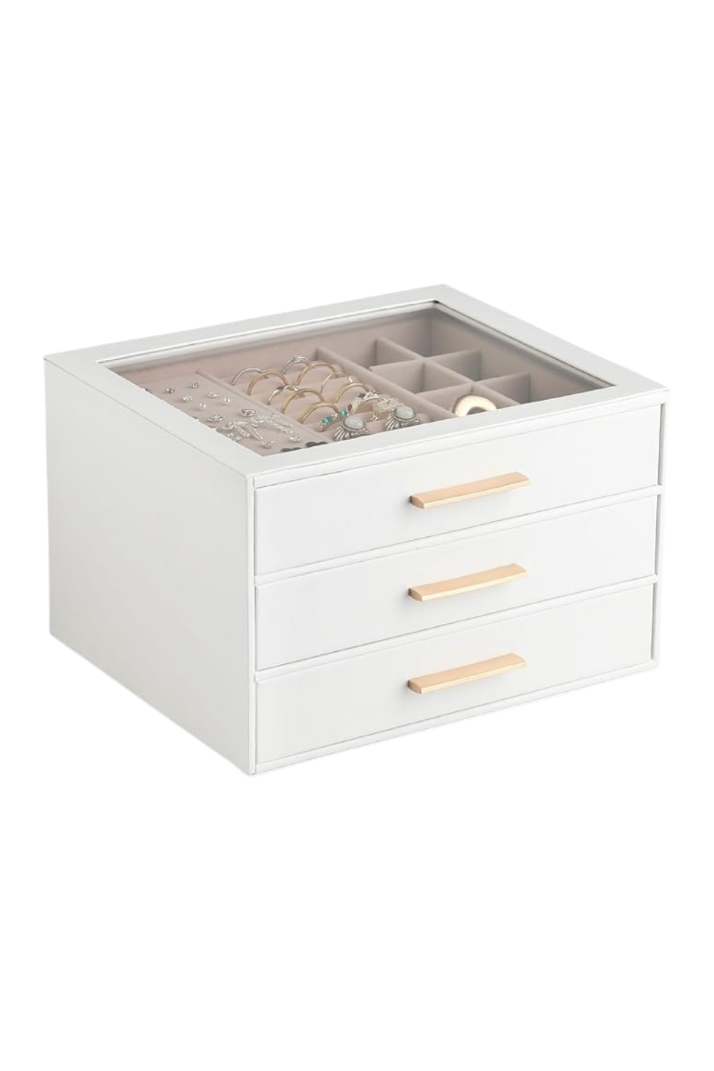 This beautiful countertop jewelry box has three drawers with a variety of spaces for your necklaces, rings, bracelets, and earrings. Shop here