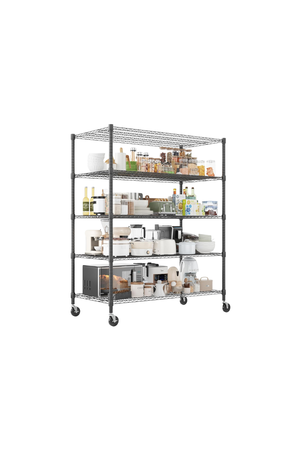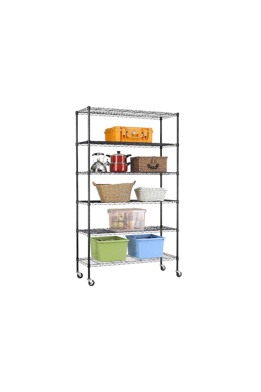 This easy-to-assemble rolling shelving unit provides great and versatile storage with fully adjustable shelves while still allowing you to move the entire unit as needed. Shop here