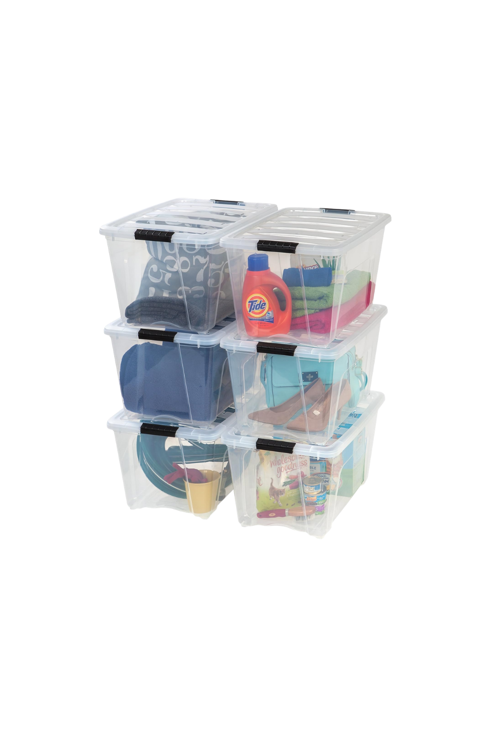 These heavy-duty stacking storage bins are perfect for larger items and are clear, so you can see what is in each bin. Shop here